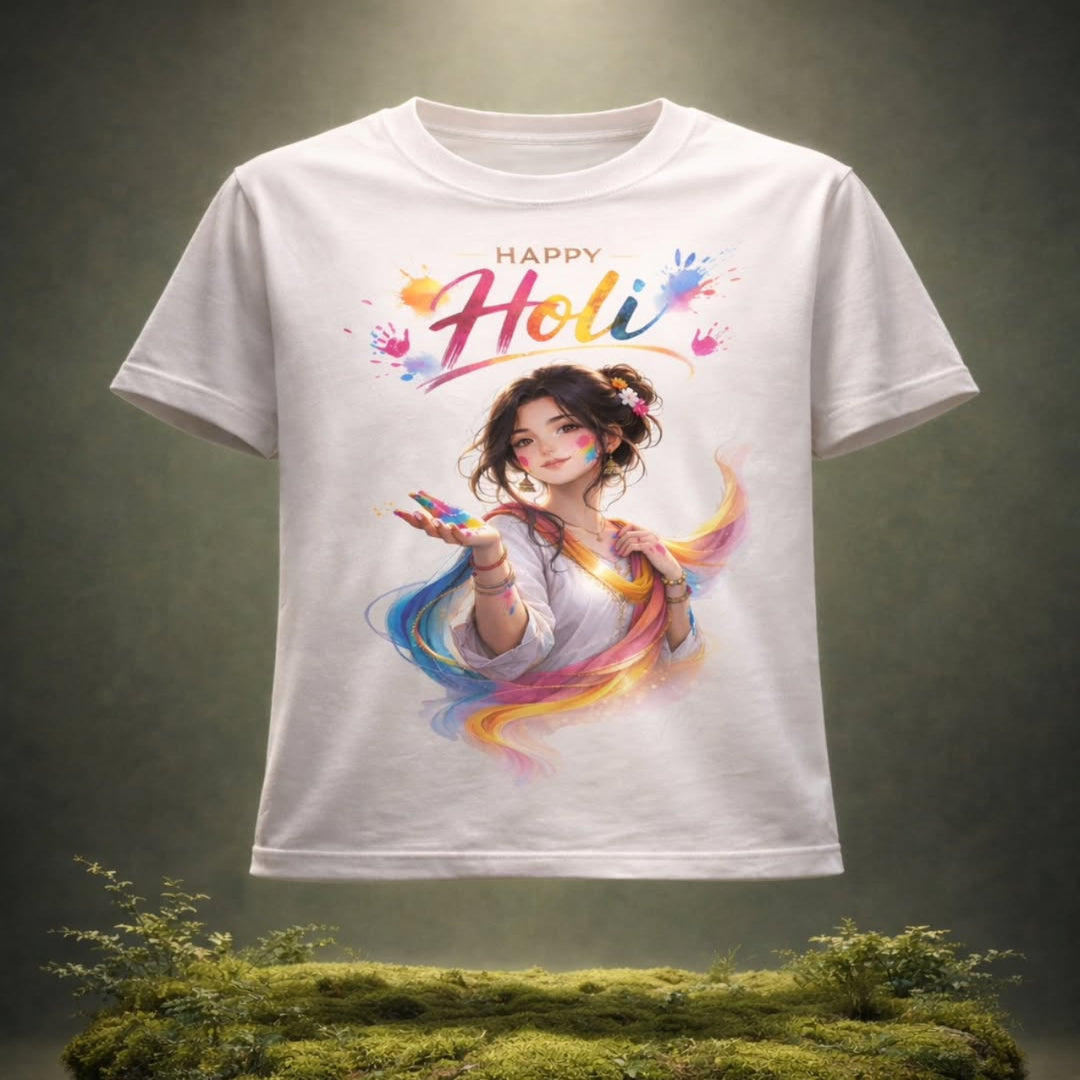 This premium cotton T-shirt features a stunning illustration of a graceful woman offering vibrant gulal — creating the perfect blend of tradition, joy, and feminine charm.